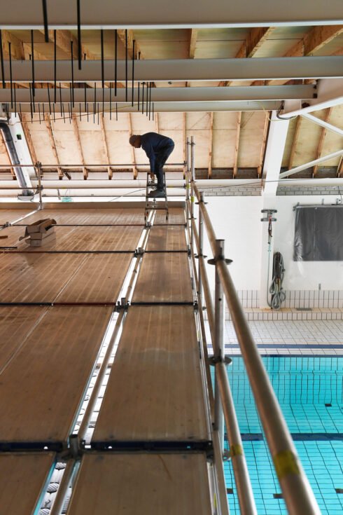 Vrij recent hebben wij steigers op pontons gemonteerd voor het vernieuwen van het plafond in het zwembad IJzeren Man te Weert in opdracht van Gepla B.V.